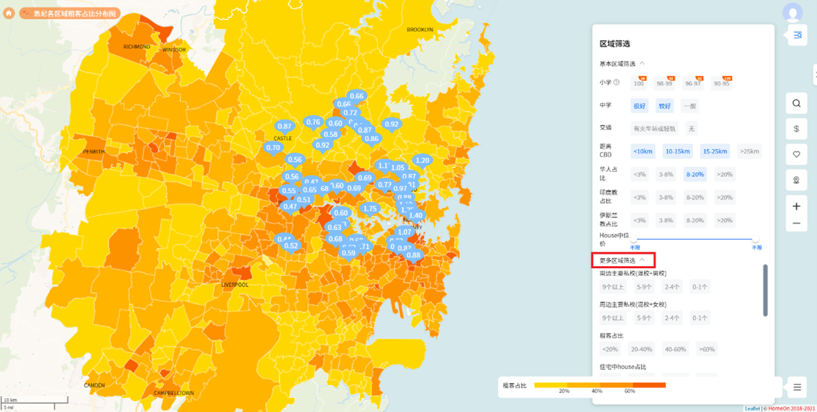 3. 除了按Suburb的公立学校评分、交通便利程度、人口构成、House中位价格等常用条件进行筛选Suburb外,如果对居住区域有更多的要求,点击『区域筛选』窗口底部的『更多区域筛选』按钮即可出现包括以下选项在内的更多区域筛选项: